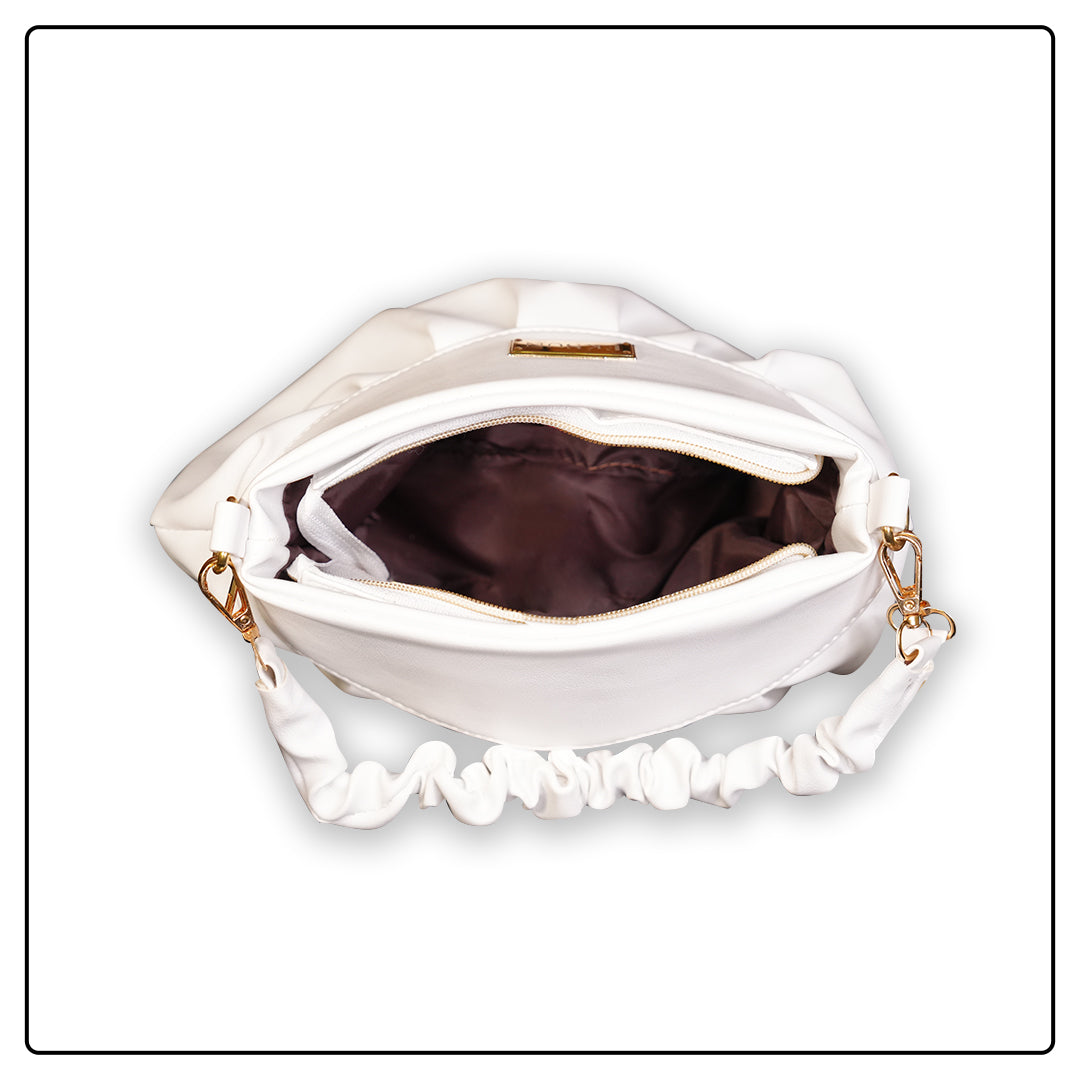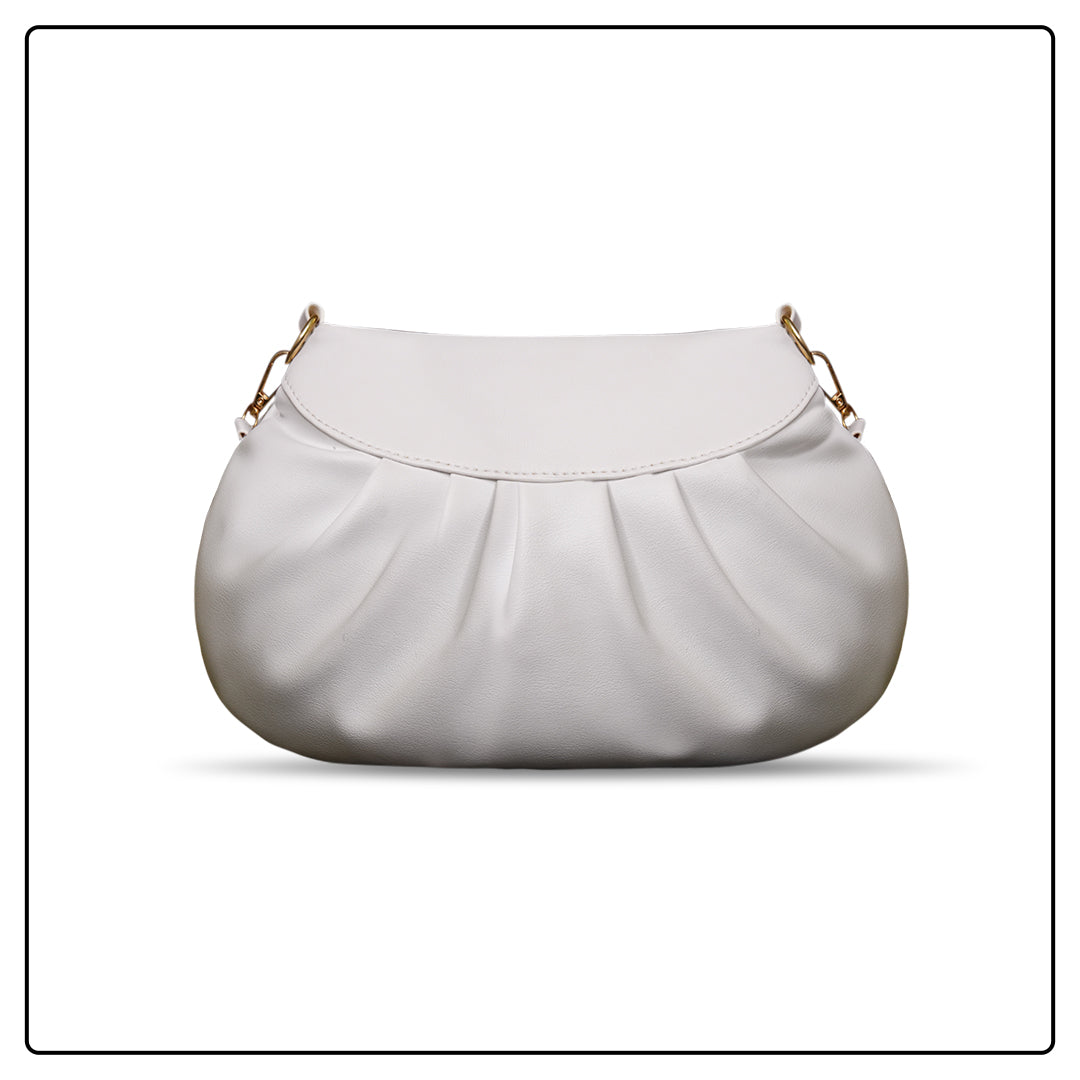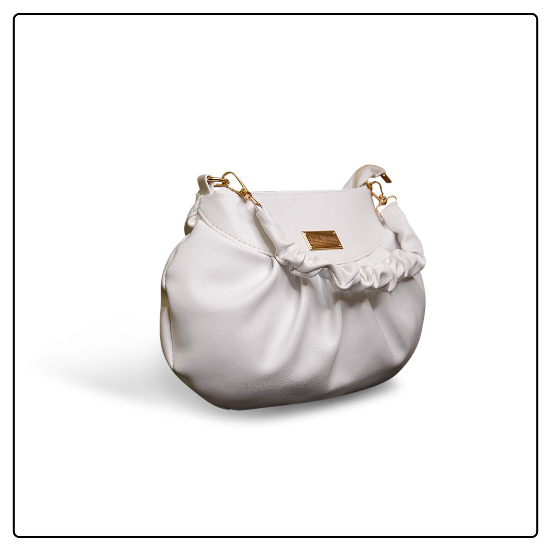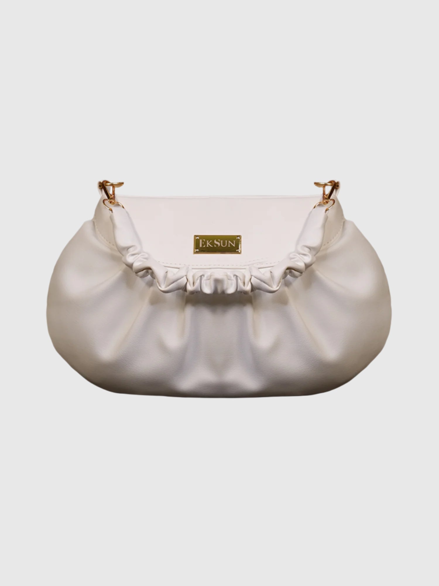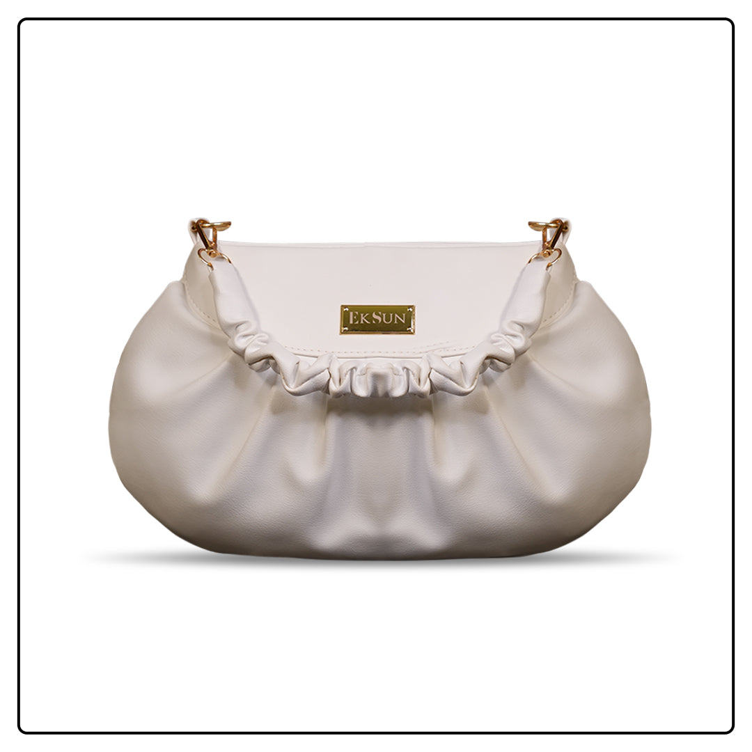 Turn every look into a fashion statement with the EK SUN White Shoulder Bag, a timeless accessory crafted in premium PU leather. This elegantly ruched design with soft gathers and a glossy gold-tone EK SUN logo makes it a must-have addition to any wardrobe. Perfect for parties, dinners, or everyday glam, this bag blends modern minimalism with feminine flair. With a secure top zip closure and a compact yet roomy interior, it keeps your essentials organized and easily accessible while elevating your style quotient.